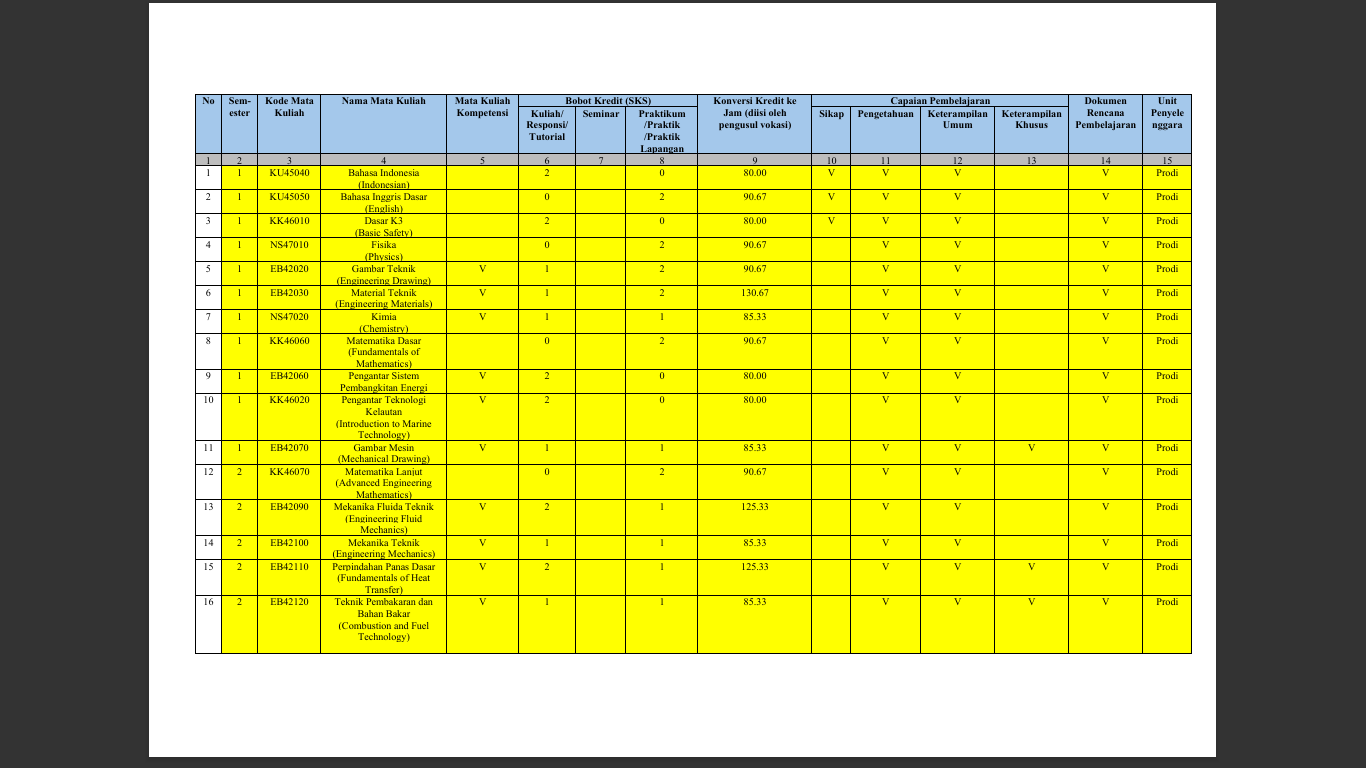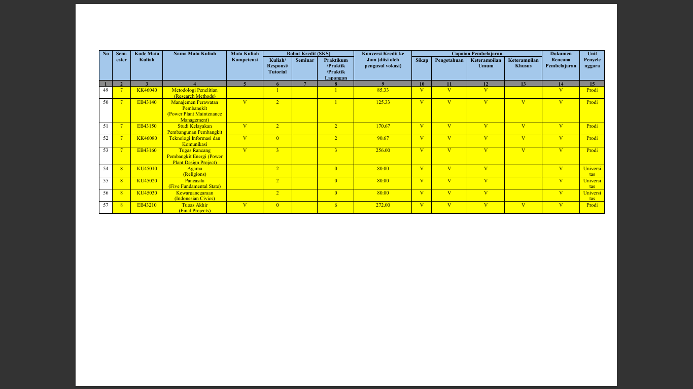 Struktur Kurikulum Prodi D4 Teknologi Energi Berkelanjutan adalah sebagai berikut :